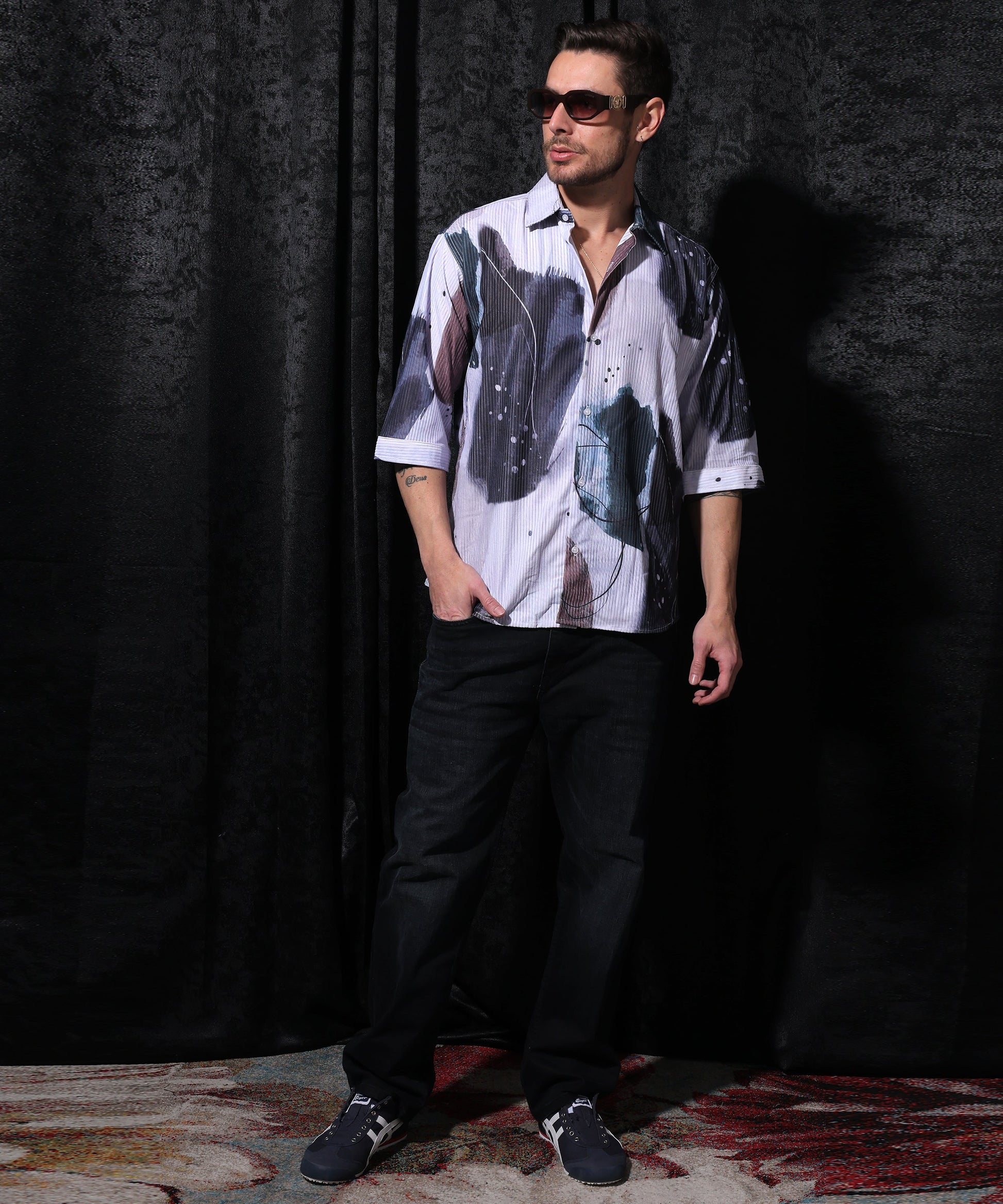 Make an artistic statement with this expressive men's abstract print shirt. Featuring a wide, painterly design with strokes of white, gray, burgundy, and dark tones, this shirt embodies modern, creative style. The relaxed fit and short sleeves make it an ideal piece for summer events, festivals, or contemporary casual wear.