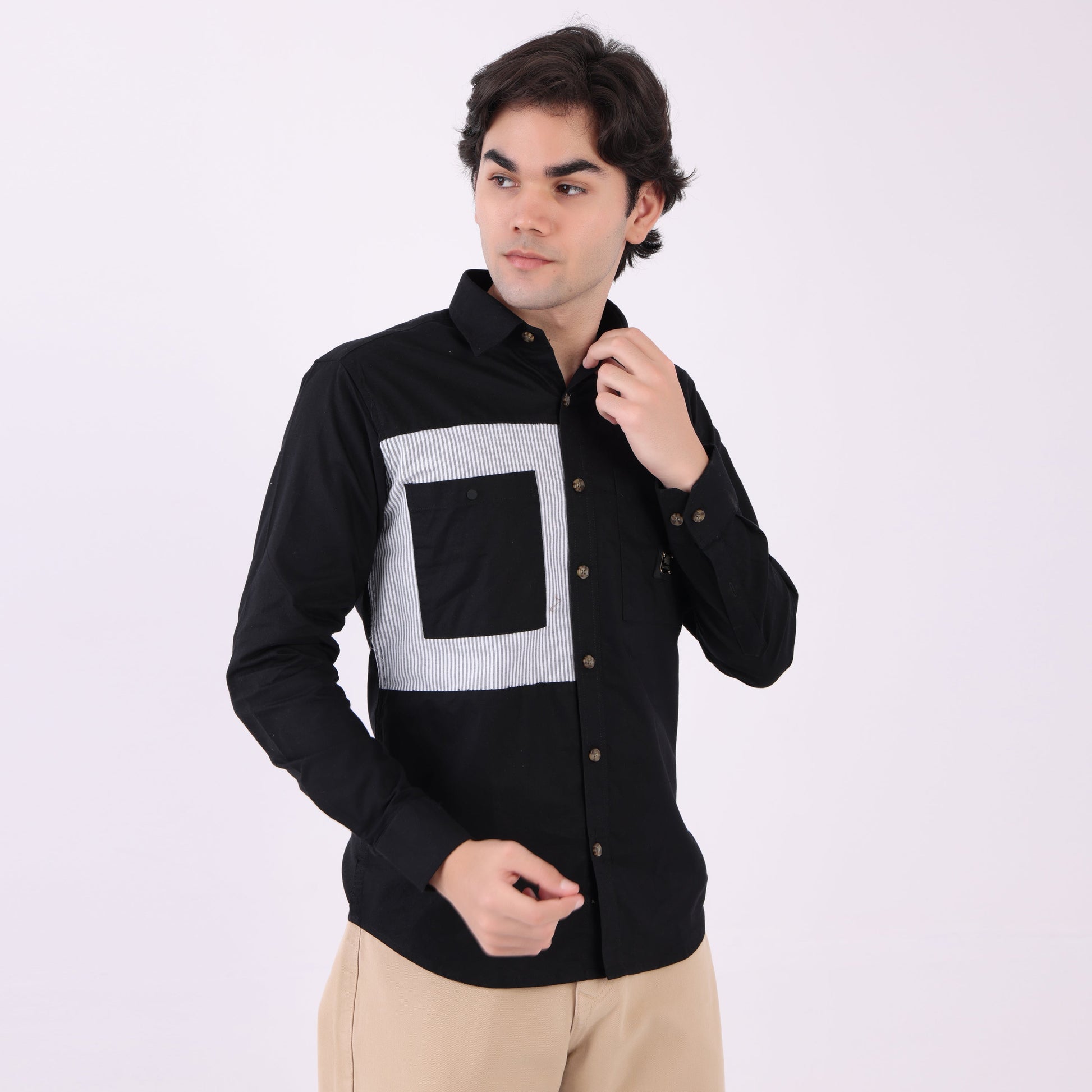 This striking men's black casual shirt delivers a bold, modern aesthetic perfect for streetwear or a graphic smart-casual look. The solid black body is dramatically contrasted by a large, square pinstripe panel on the chest, which frames the utility flap pocket. The monochrome color scheme ensures versatility while the design provides a unique, eye-catching detail.