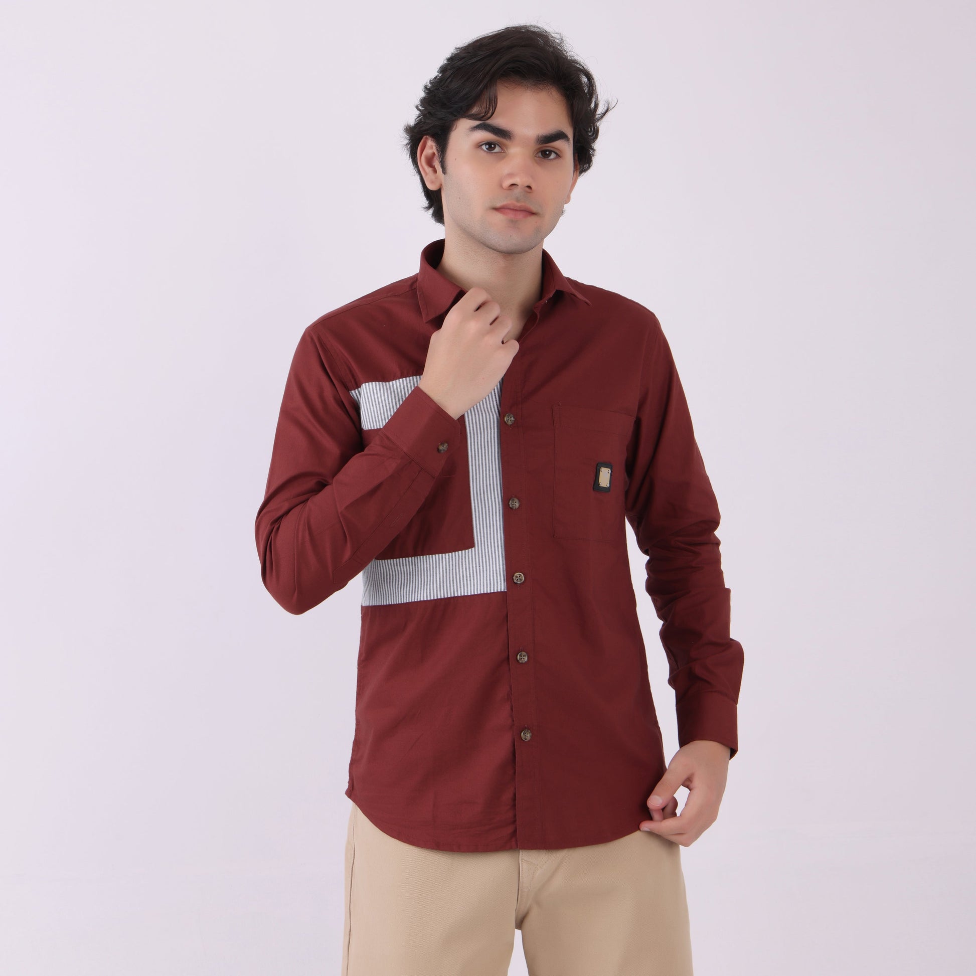 Make a sophisticated yet modern statement with this men's maroon casual shirt. The rich burgundy or maroon fabric is dramatically contrasted by a light gray pinstripe panel that wraps around the shoulder and chest in a unique, geometric shape. This tailored shirt is perfect for date nights, smart-casual events, or adding graphic flair to your wardrobe.