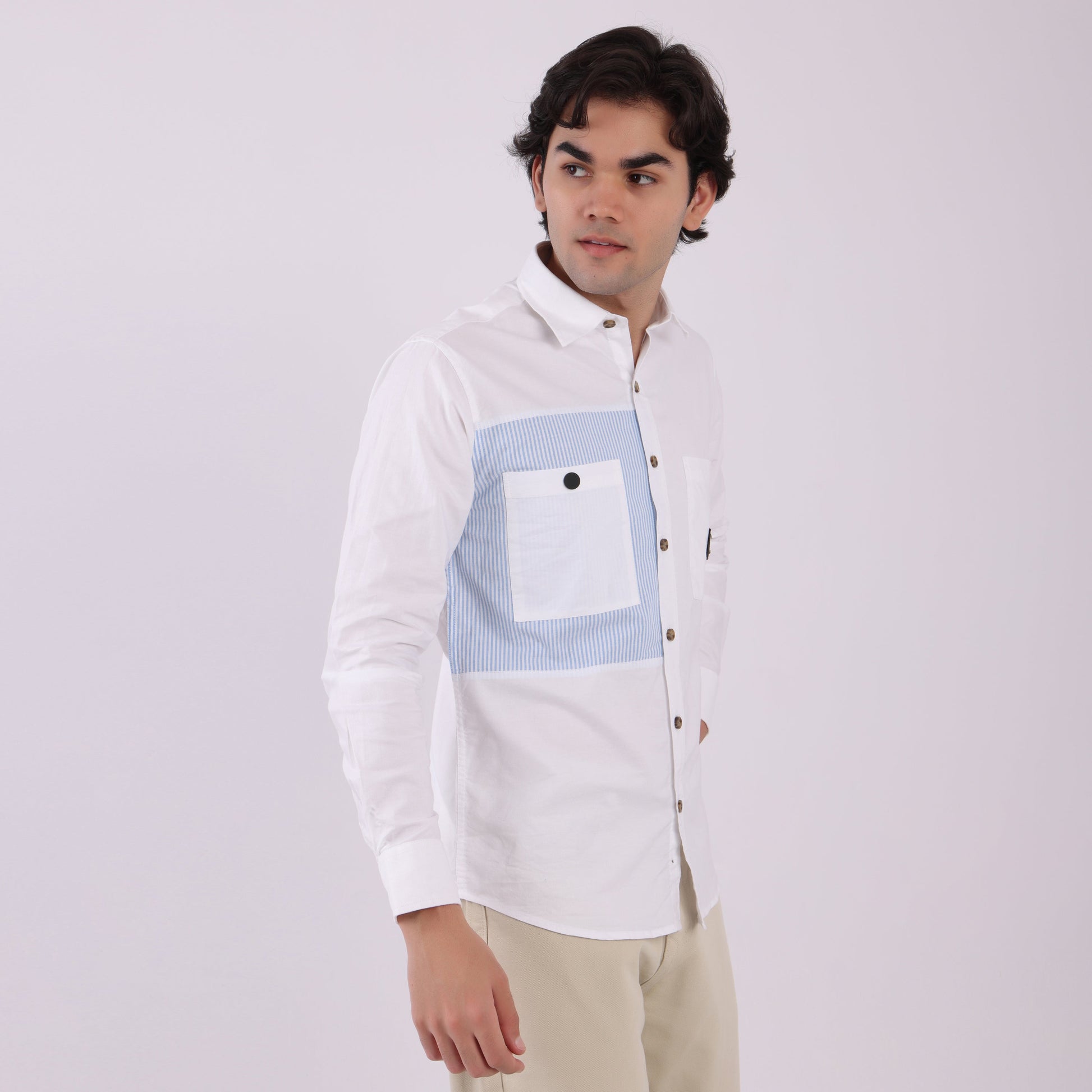 Update your casual rotation with this fresh men's white shirt featuring a unique contrast detail. The crisp white body is accented by a striking light blue striped panel on the chest that incorporates a clean white utility pocket. This contemporary design is perfect for a refined, yet casual, summer look.