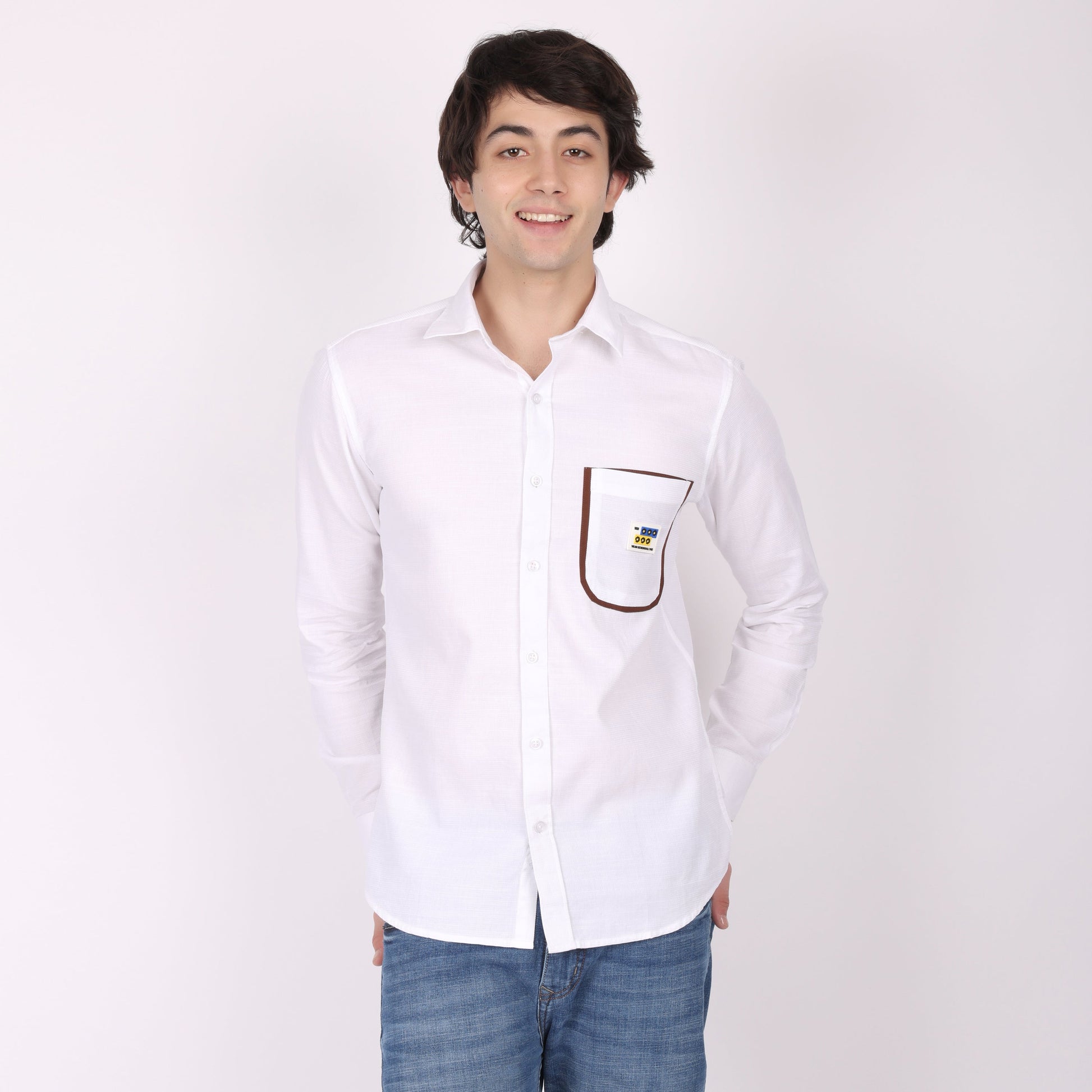 Elevate your everyday and business casual style with our Men's White Long-Sleeve Shirt, a timeless piece that has been given a unique, modern update. This isn't just a basic white shirt; it’s a confident statement of personal style. The crisp, clean white fabric provides a perfect canvas, drawing all attention to the distinctive contrast-colored chest pocket. The pocket features a bold brown border, creating a striking visual contrast that sets this shirt apart from the rest. This subtle but impactful detail adds a touch of modern flair and sophistication to a classic silhouette.